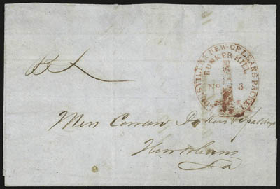 Louisville & New Orleans Packet Bunker Hill No. 3.. Well-struck red illustrated handstamp on illustrated bill of lading with yeardate cut off, to New Orleans, manuscript initials at left, some slight wear incl. splitting along folds, still Very Fine strike of this scarce marking, the Bunker Hill No. 3 was built in New Albany Ind. in 1849 and its first captain, Job. Whipple, died aboard ship between Natchez and Memphis on March 25, 1849 (several other crew members also died of cholera), this item was carried outside of the mails from Uniontown Ky. to New Orleans